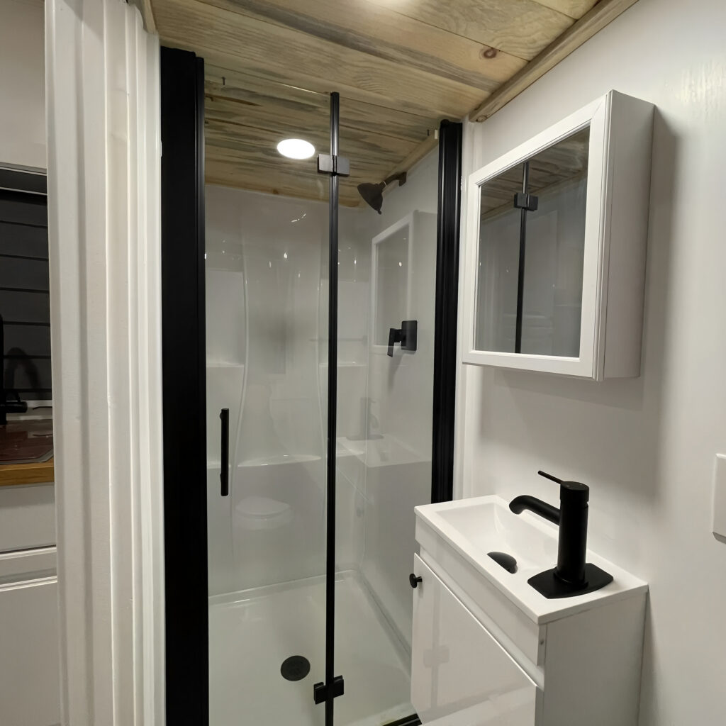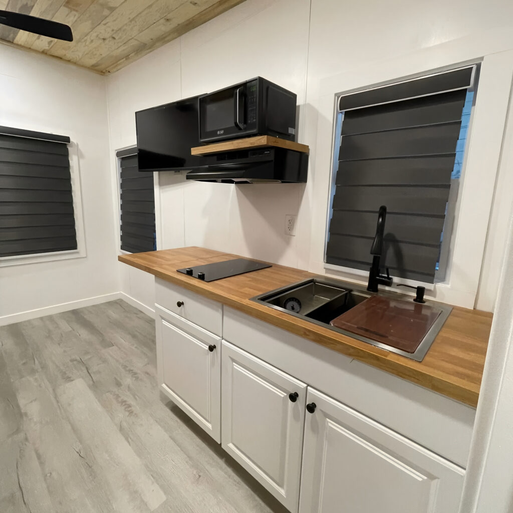 Step inside and be amazed at how space has been utilized to deliver unmatched convenience. The Tiny Home features a cozy, inviting living area complete with multipurpose furniture, a sleek kitchenette equipped for your culinary exploits, and clever storage solutions to keep your belongings organized. The loft sleeping area ensures restful nights, while the spacious bathroom provides all the comforts of home.
